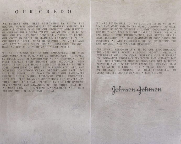 Except No More Tears is not another car crash book. Johnson & Johnson still features in the list of the World’s Most Admired Companies and continues to be one of only two corporations on earth with a triple-A credit rating. Its former CEO has won numerous awards and now sits on the boards of JPMorgan Chase and Apple. It was when he served as Chair of the Business Roundtable Corporate Governance Committee that the Purpose repositioning came out and it appears to derive much of its language and ethos from one of the earliest of such statements: Johnson & Johnson’s 1943 Credo.